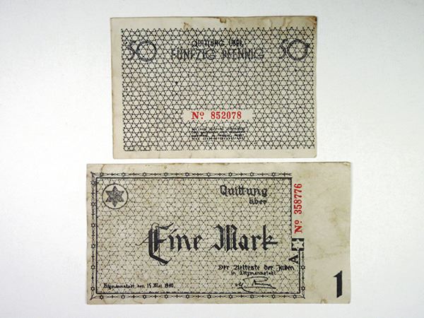 Germany, Lot of 2 notes, both dated 15th May, 1940, Includes 50 Pfennig, light purple, VF with light stains; and, 1 Mark, Olive green, VF with handling, both P-Unlisted, Star of David top left, back with menorah and Star of David. The Litzmannstadt Ghetto was a World War II ghetto established by the Nazi German authorities for Polish Jews and Roma following the 1939 invasion of Poland. It was the second-largest ghetto in all of German-occupied Europe after the Warsaw Ghetto. (2)