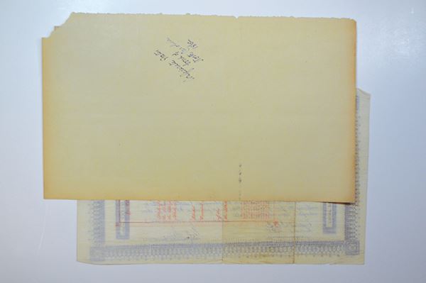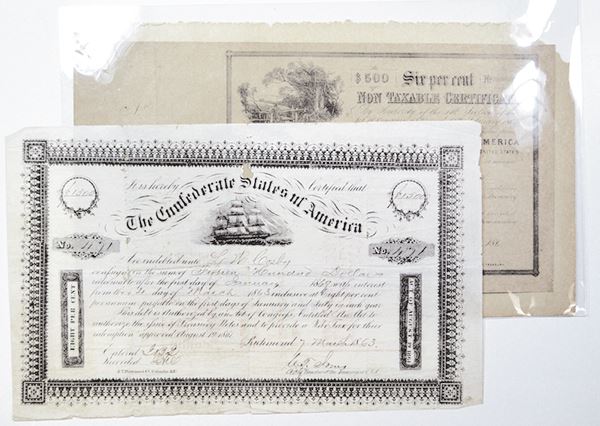 CSA. Blank $500 certificate mounted on old scrapbook page, Issued 1863 8% bond for $1500. Pasture scene, Sailing ship respectively. Fine, holed. 2 pieces.