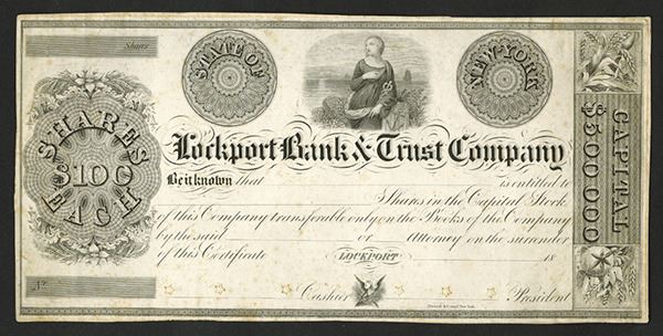 Lockport, NY. Odd Shares, Proof, Printed on thin card, Standing allegorical woman on top middle, large medallion on left counterfoil, corn and wheat on right counterfoil. AU with toning. Durand & Co. Rare early banking proof. (From the collection of John E. Herzog)