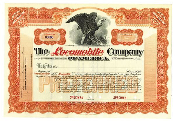 West Virginia. Gray border, 100 shares Specimen, eagle on rock, "Locomobile" in red, ABNC, EF. The company originally produced steam powered cars.