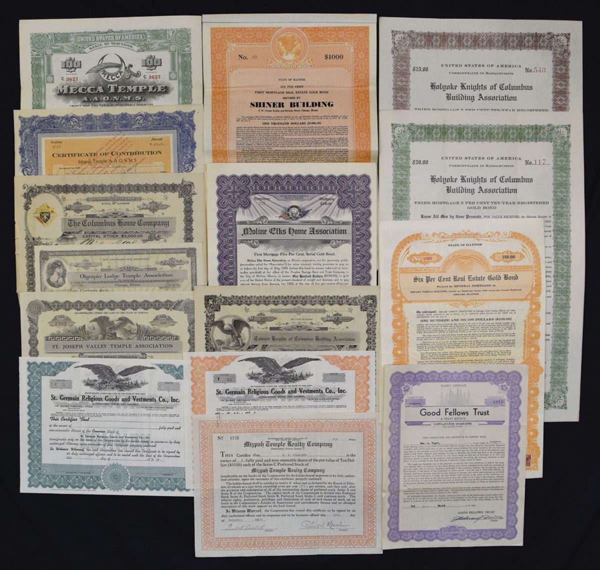 Various States, ca.1900-40s. Lot of 15 I/U and I/C Stock and Bond Certificates relating to fraternal organizations, temples, lodges, religious institutions, and associated building associations. Attractive assortment with classic eagle vignettes, fraternal symbols, and ornate engraved borders. Includes pieces from Mecca Temple A.A.O.N.M.S.; Shiner Building; Holyoke Knights of Columbus Building Assn. (multiple denominations); Columbus Home Co.; Moline Elks Home Assn.; Olympia Lodge Temple Assn.; Mitzpah Temple Realty Co.; Good Fellows Trust; and others. Conditions range from VF to AU with typical folds and handling. (15). Sold ‘AS IS’ no returns accepted.