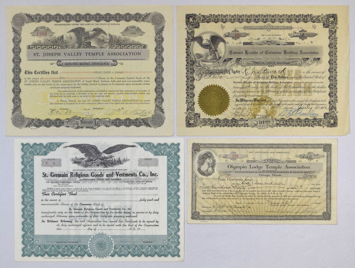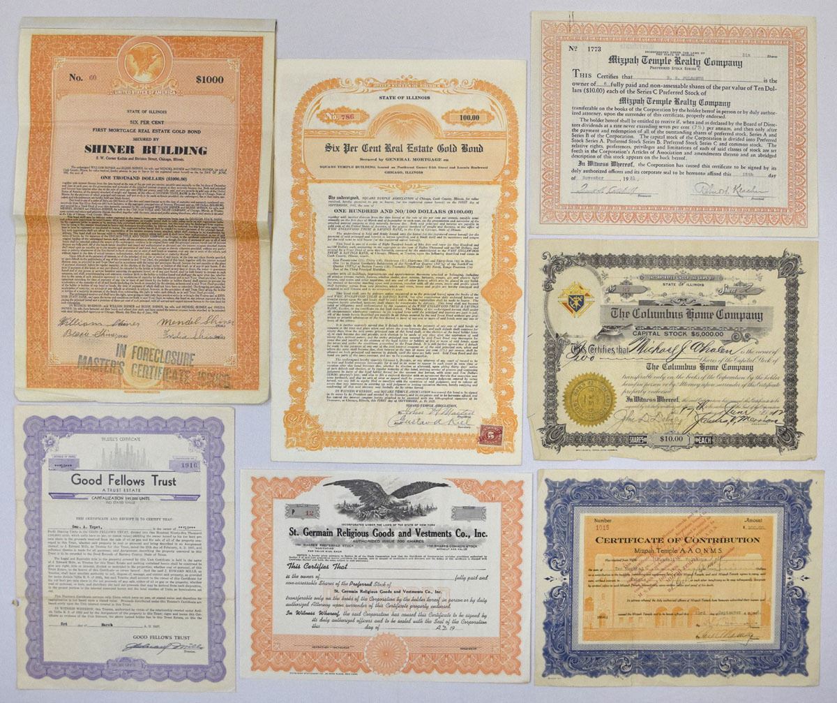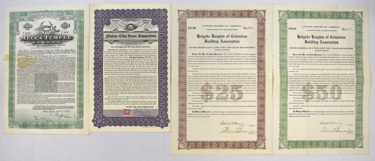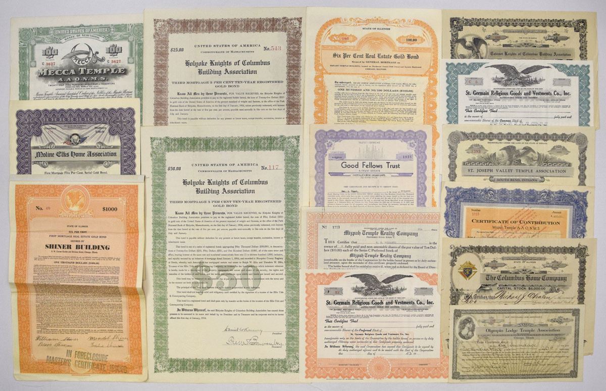 Various States..., ca.1900-40s. Lot of 15 I/U and I/C Stock and Bond Certificates relating to fraternal organizations, temples, lodges, religious institutions, and associated building associations. Attractive assortment with classic eagle vignettes, fraternal symbols, and ornate engraved borders. Includes pieces from Mecca Temple A.A.O.N.M.S.; Shiner Building; Holyoke Knights of Columbus Building Assn. (multiple denominations); Columbus Home Co.; Moline Elks Home Assn.; Olympia Lodge Temple Assn.; Mitzpah Temple Realty Co.; Good Fellows Trust; and others. Conditions range from VF to AU with typical folds and handling. (15). Sold ‘AS IS’ no returns accepted.