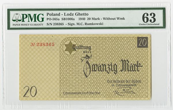 Lodz Ghetto, Poland. Issued 20 Mark, 1940, PO-565a, SB1006a, S/N 238365. Graded Choice Unc 63 by PMG and finest known.