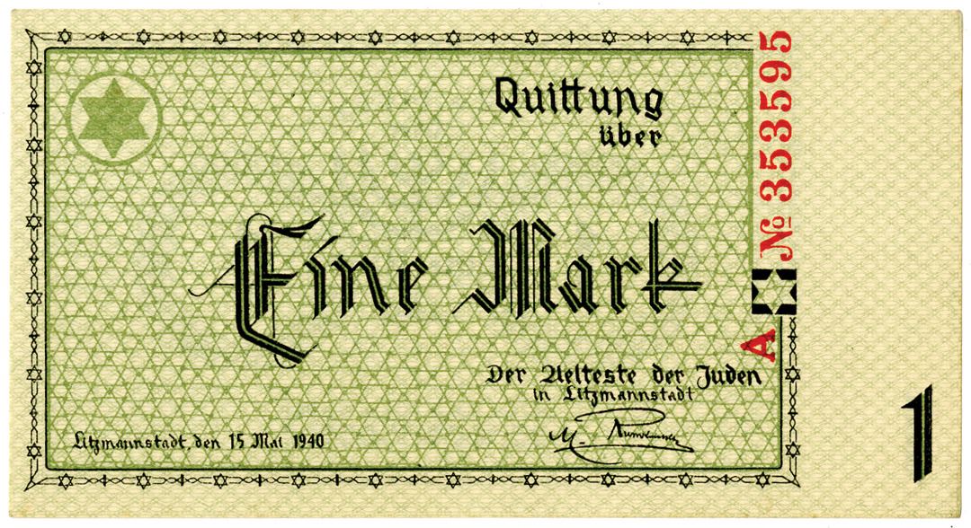 Poland & Germany. 1940. 1 Mark, P-NL, issued banknote, The Lodz Ghetto was the second largest Jewish ghetto, and was located in Lodz Poland which was renamed Litzmannstadt by the Germans to honor a WWI general. The ghetto was sealed off from other areas of the city in May 1940. Seven scrip denominations of notes were produced, including this and the previous lot. All were signed by Rumkowski as Der Aelteste der Juden in Litzmannstadt., Ch. XF to AU. (From the Allen Berk Collection)