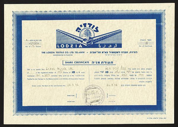 Palestine, stating that the Zevue Aryeh LTD has 1050 shares. Simple blue border with vignette in the middle written in Hebrew, English, and Arabic. I/U Fine condition