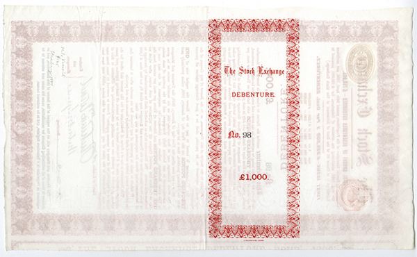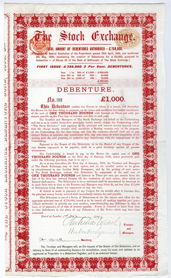 London, England. Stock Exchange (London), £1000 Pound Bond, 1899, red text and borders. No. 98. Cancelled. EF. Rare Stock Exchange bond.