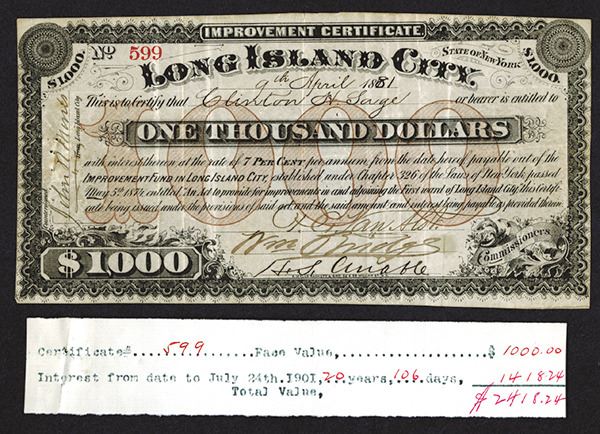 New York. $1000 7% Certificate. Issued. Circulated. Signed by early Queens developers Peter G. Van Alst, H.S. Anable and one other. Along with it is a typewritten notation formerly pinned to the document with a notation of the interest value thru July 1901. Very Good or a bit better, tightly cut edges.