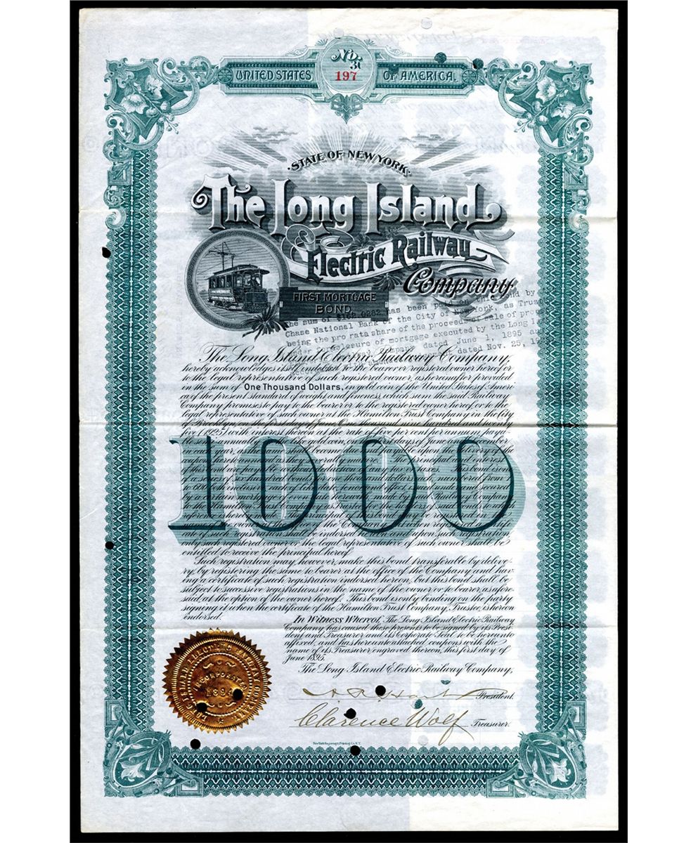 New York, 1895, Long Island Electric Railway Co. First Mortgage, $1000, 5%, Bond Certificate, VF Condition.