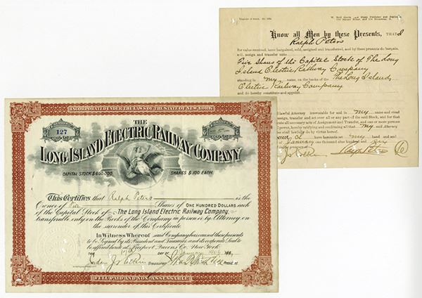 New York. 5 Shrs Stock Certificate. Issued. Cancelled with small POCs. Very Fine. Issued to Ralph Peters, president of the Long Island Rail Road, with additional transfer document also signed. 2 pieces. (From the collection of John E. Herzog)