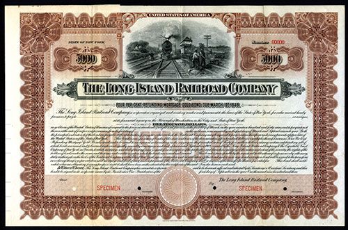New York, 1903, $5000, 4% Refunding Mortgage Registered Gold Bond, Black with brown border, track workers with locomotive straight on, Specimen overprints, POC's. Rare and popular Long Island Railroad Bond. ABNC.