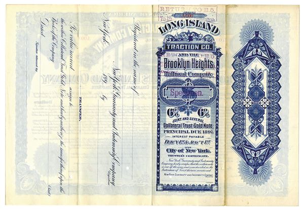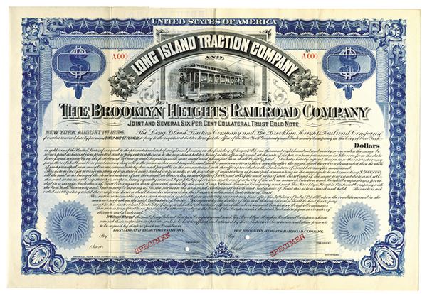 New York. $-Odd Amount Specimen 6% Joint and Several Collateral Trust Gold Note, black print on a blue border and under tint, Image at top of a street car, Specimen overprints, POC's, VF-XF condition. ABNC. Unlisted in Cox.