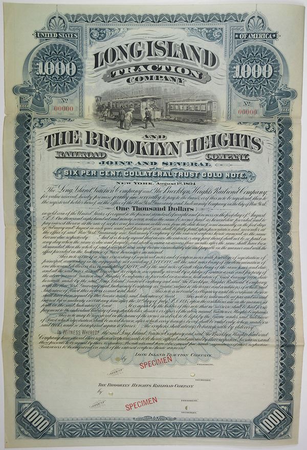 Brooklyn, New York. $1,000 Specimen 6% Joint and Several Collateral Trust Gold Note Coupon Bond. Black print on blue border and underprint. People boarding a waiting street car at top. Specimen overprints and POC's, VF-XF condition. ABNC. Unlisted bond variety on Cox, only listed as a registered bond, no coupon bonds known. This was the only example found.