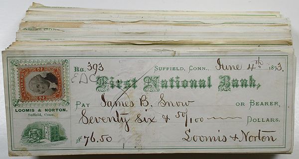 Suffield, Connecticut, ca. 1870s. 211 pieces of I/C checks from the First National Bank, located in Suffield, Connecticut. All have green text with a thin green border, Dog with safe depicted at left below an adhesive internal revenue stamp. Fine to XF condition. The First National Bank of Suffield was established in 1864. Unsearched for autographs. 211 pieces.