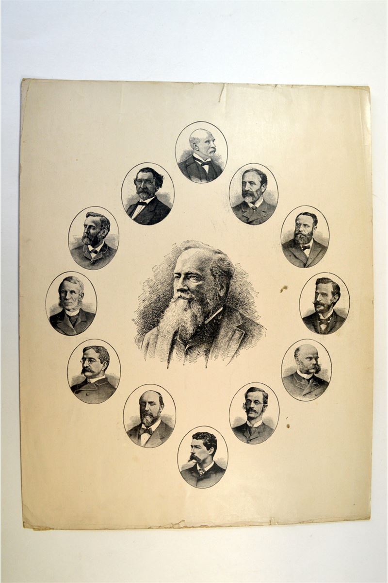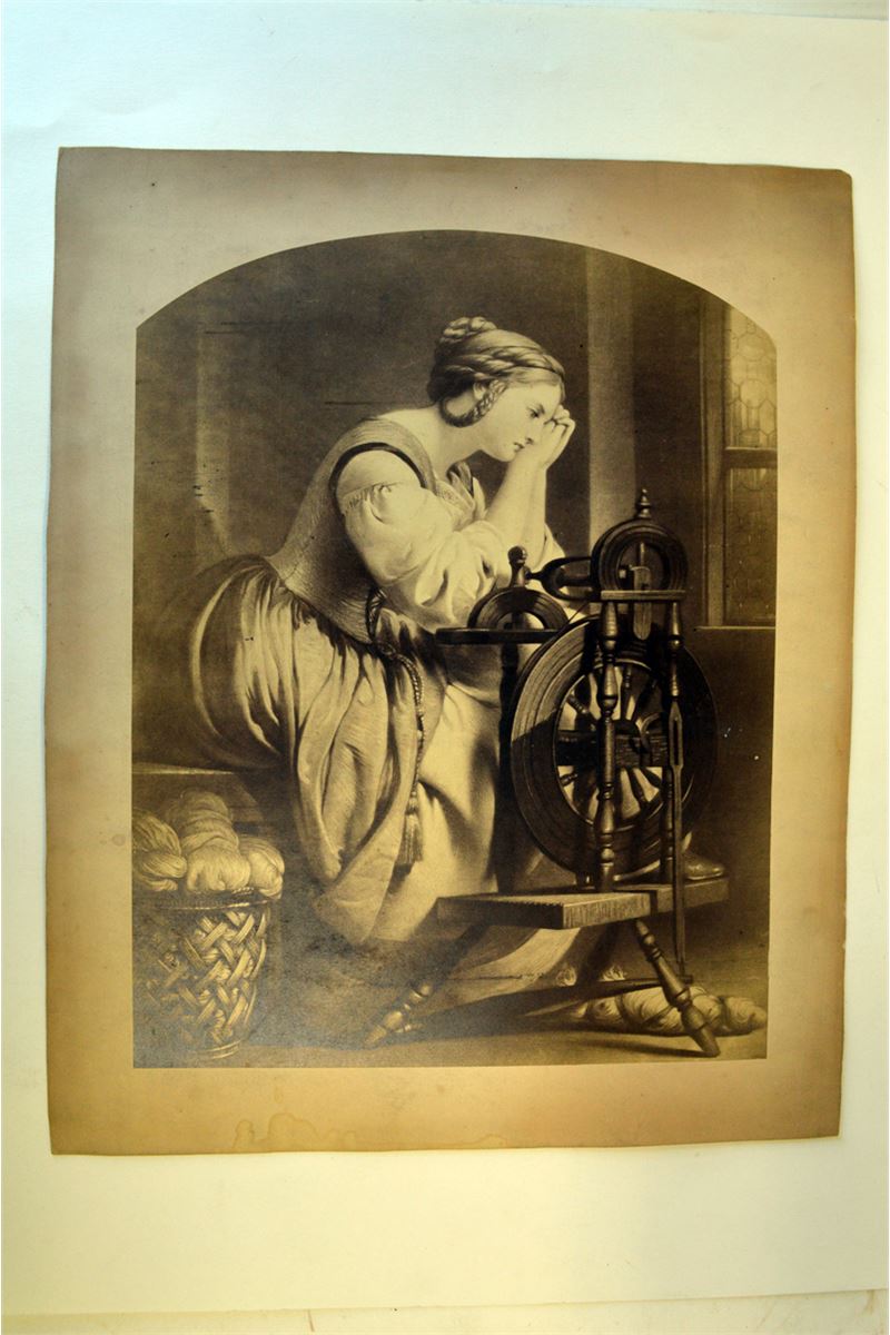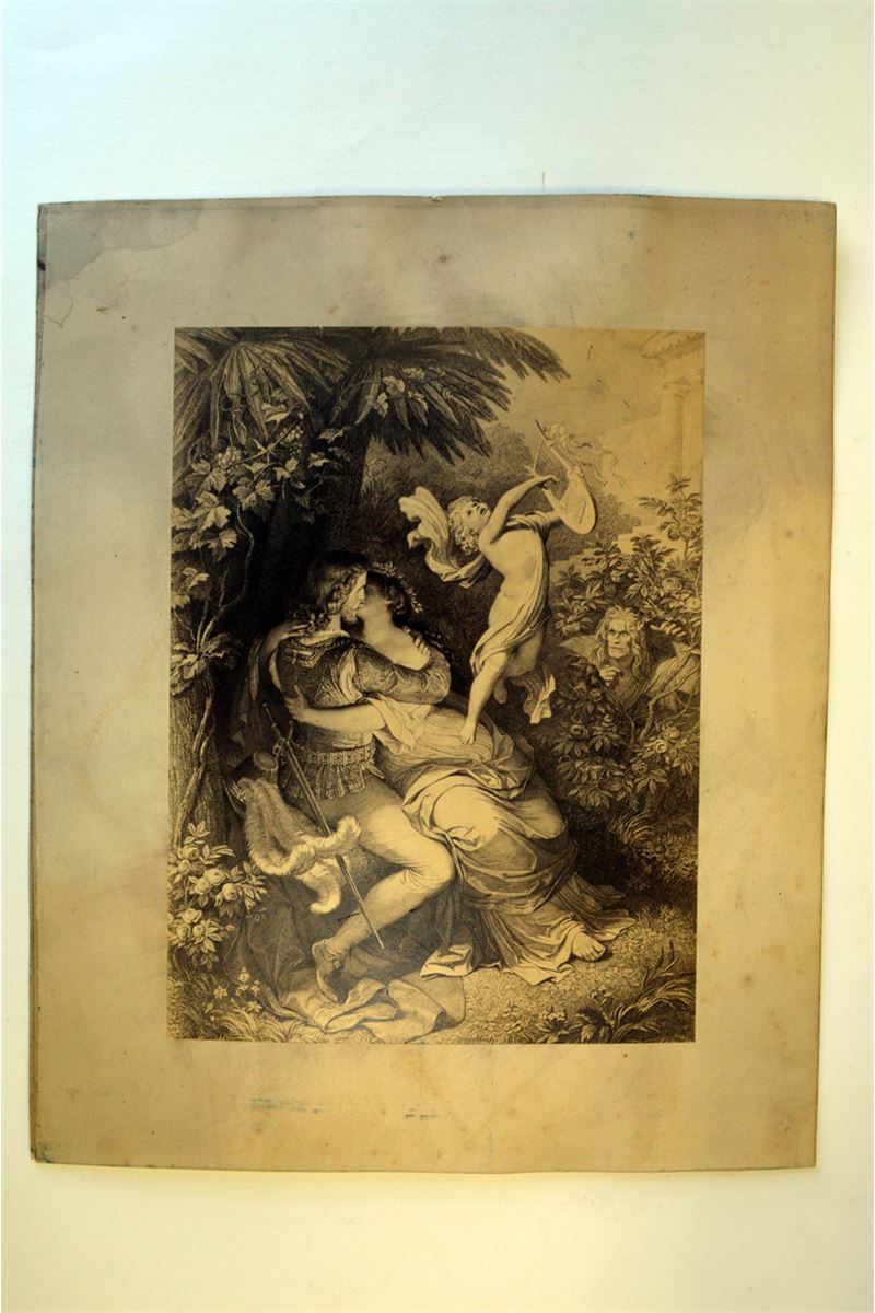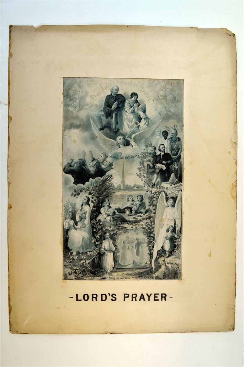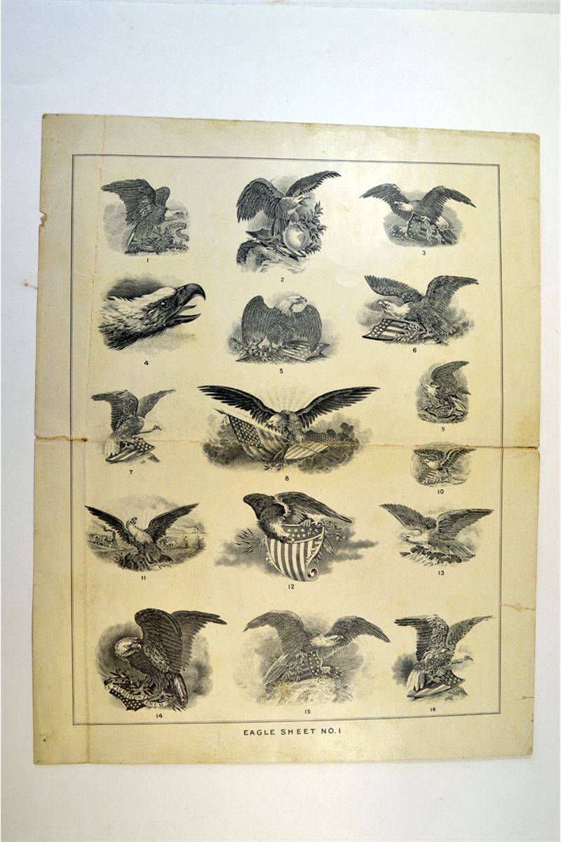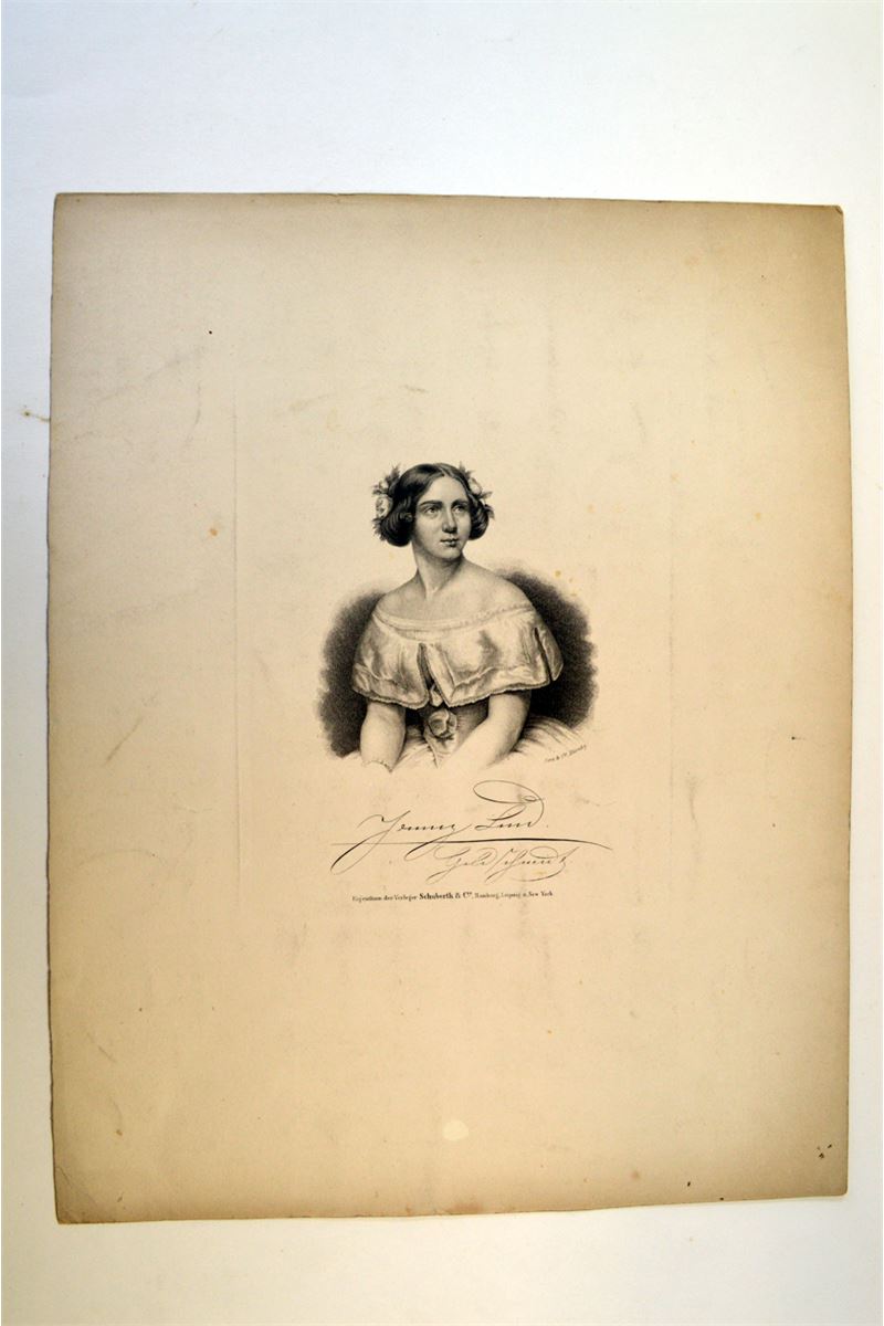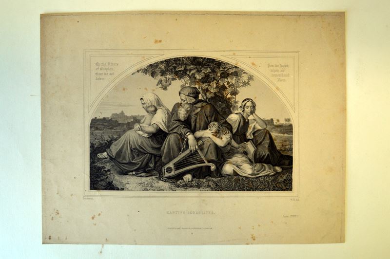 Intricate image of words and scenes. Mounted to card (which covers the imprint). Chipping to card. 5-1/8x8-3/4 image area. Slight foxing; Captive Israelites. Group seated within linear frame. 8-1/2x5-3/4. Light foxing; Female looking forlorn seated at spinning wheel. 12-1/2x15. Edge tone to mounting board. Couple kissing in fort, muse above, older figure spying on them. Signed in photo Mhaulbach, 1860. Tone to mounting board. Jenny Lind image by Seers & Co. Nurnbg. Distributed by Schuberth & Co. on large card stock. Slight edge tone. Litho prints of 12 men around central figure and a sheet of eagles. 7 pieces.