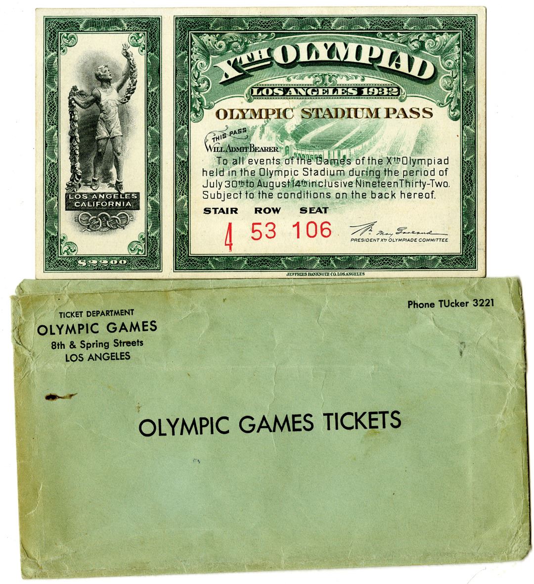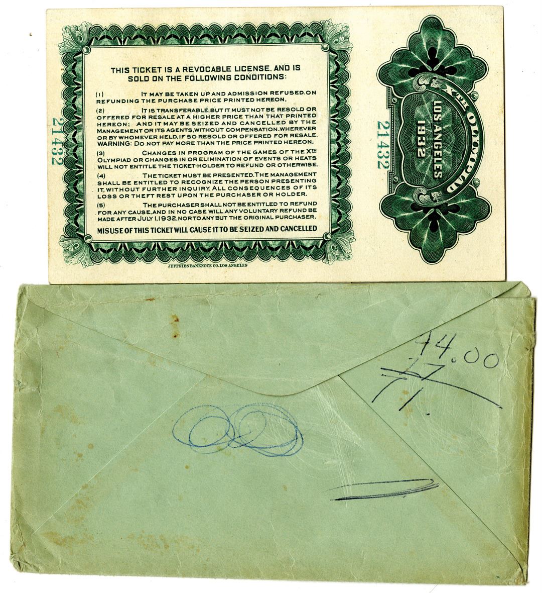 Los Angeles, California, 1932. Lot of 2 pieces, Includes: $22, Pass to the Olympic Stadium for the Xth Olympiad, for Stair 4, Row 53, and Seat 106. S/N 21432 on back, "Will admit bearer to all events of the games of the Xth Olympiad.......from July 30th to August 14th inclusive 1932". Black on green border and underprint with an undertint of the Coliseum in the middle, and allegorical young Olympic participant at left over Olympic rings, back in green with rules as to the use of the ticket, Uncirculated condition, Also includes an accompanying envelope with return address listed as the Ticket Department for the Olympic Games. Jeffries BNC, Los Angeles. (2)