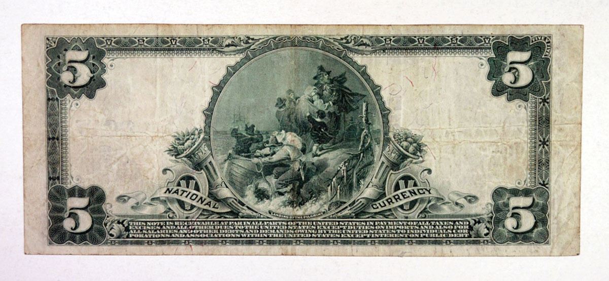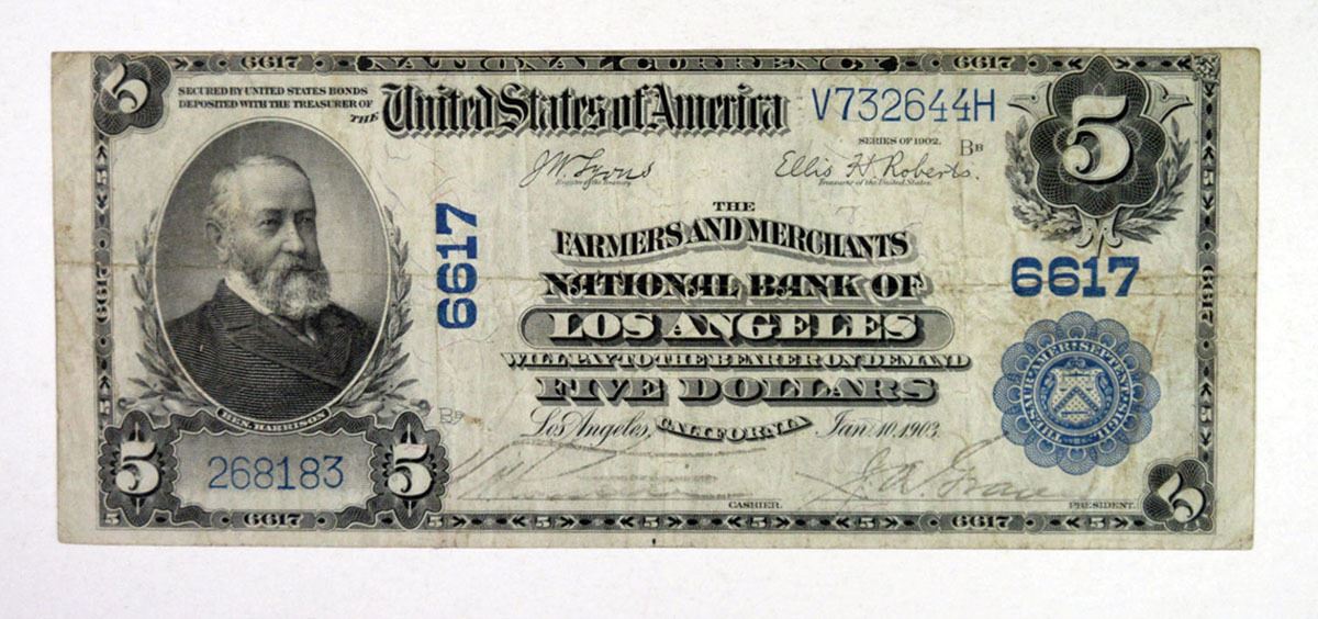 Los Angeles, California, The Farmers and Merchants National Bank of Los Angeles, 1903. $5, Series 1902 PB, Ch# 6617, Issued Banknote, Black printing with blue Seal and serial numbers, Portrait of Benjamin Harrison at left, Back is green with Landing of Pilgrams at center, CH# 6617, S/N 268183-V732644H, Close cut margin at top, Fine to VF condition.