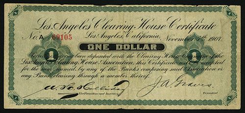 Los Angeles, California. November 5th, 1907. $1. Issued depression scrip. Black and green on light green, no vignettes, back green with eagle. Fine+ to VF condition with small nicks on top margin. Scarce 1907 scrip note that is seen infrequently and one of the few notes seen from Los Angeles.