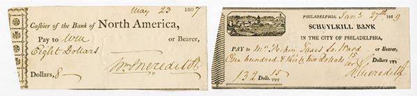 Philadelphia, PA. Lot of 2 checks. Both checks are signed by Wm. Meridith. William Morris Meredith (June 8, 1799 _ August 17, 1873) was an American lawyer and politician from Philadelphia, Pennsylvania. He served as the United States Secretary of the Treasury, during President Zachary Taylor's Administration. Meredith's portrait is depicted on the 5th issue 10-cent Fractional currency note.