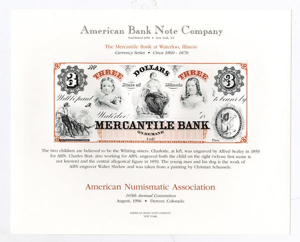 ANA August 1996, Denver, CO Convention Card, $3, Mercantile Bank Obsolete with description printed on card with ABN certification on back. Mint condition, Lot of 21 pieces.