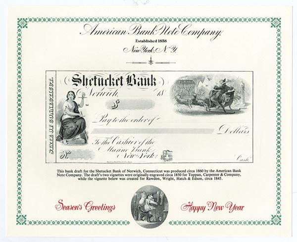 "Seasons Greetings" 1993 Convention Card, $Odd check of Shetucket Bank of Norwich, CT with description printed on card with ABN certification on back. Mint condition, Lot of 25 pieces.