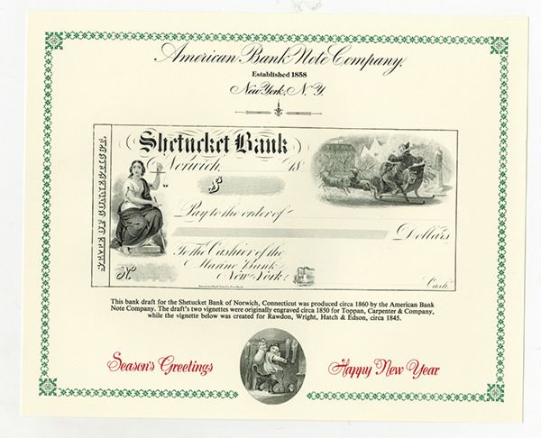 "Seasons Greetings" 1993 Convention Card, $Odd check of Shetucket Bank of Norwich, CT with description printed on card with ABN certification on back. Mint condition, Lot of 25 pieces.