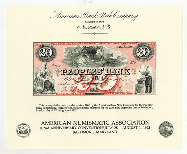 ANA July/August 1993, Baltimore, MD Convention Card, $20, Peoples' Bank Obsolete with description printed on card with ABN certification on back. Mint condition, Lot of 50 pieces.
