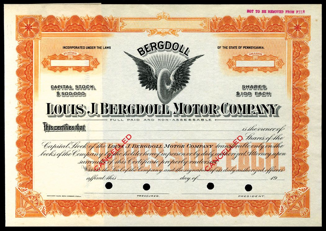 Odd Shares, Specimen stock certificate. Orange border. Winged automobile tire with "Bergdoll" in arch over it. POC's. XF condition. Louis Bergdoll, a German immigrant, founded the Louis Bergdoll & Son's Brewing Company in 1849. The company was very successful for over 70 years until prohibition and eventually was dissolved in 1951. He was also known as an amateur automobile racer in the early automobile era at the turn of the century. He favored and raced a 60 HP "Benz". He was so fond of cars, he started his own automobile company, The Louis J. Bergdoll Motor Company, that was in existence from 1910 to 1913. It is not confirmed if a "Bergdoll" automobile was ever built. Historic, attractive and rare early automobile stock certificate. 2 found in archive, one red and one orange. The orange one is offered in this sale and is the only one available.