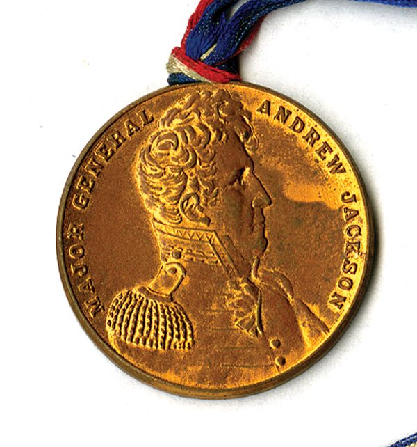 Louisiana. 1915. Battle of New Orleans Commemorative Medal 29mm. Bronze. Portrait bust of General Andrew Jackson in full uniform facing right on the obverse. On the reverse two allegorical female figures fight over a victory laurel wreath. Suspended on a red, white and blue ribbon. Scarce. Almost Uncirculated, with a great deal of original red luster. Scarce.