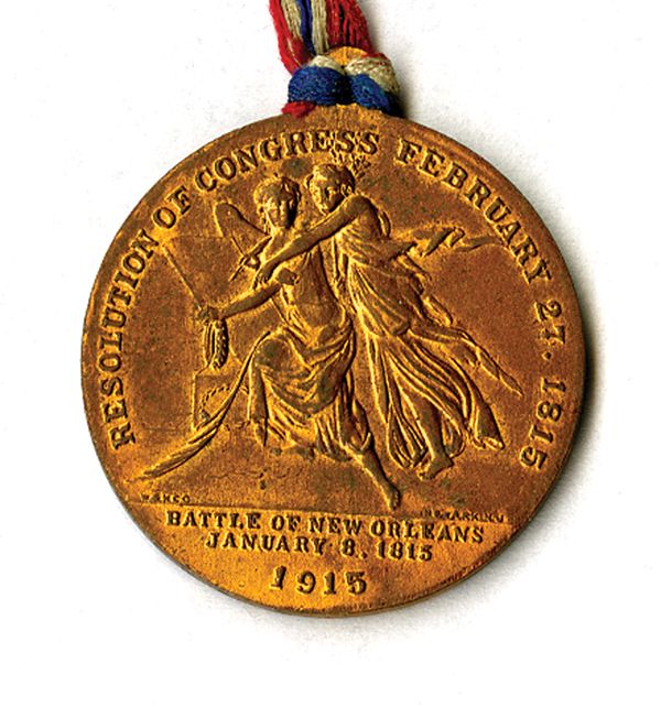 Louisiana. 1915. Battle of New Orleans Commemorative Medal 29mm. Bronze. Portrait bust of General Andrew Jackson in full uniform facing right on the obverse. On the reverse two allegorical female figures fight over a victory laurel wreath. Suspended on a red, white and blue ribbon. Scarce. Almost Uncirculated, with a great deal of original red luster. Scarce.