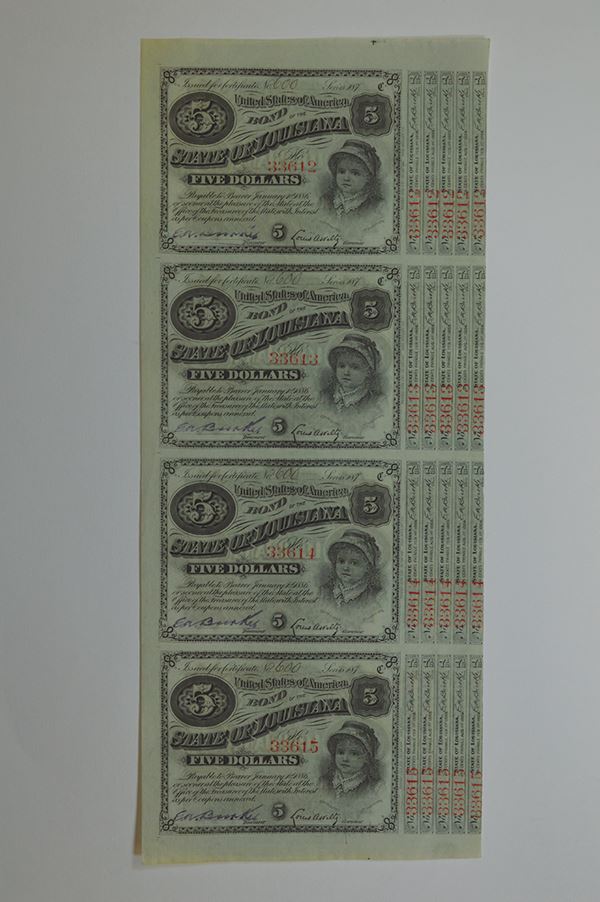 United States. Louisiana. $5 Series 1879 Bond. Uncut sheet of 4, with 5 coupons each. Western BNC and Fred Hoyland imprint.