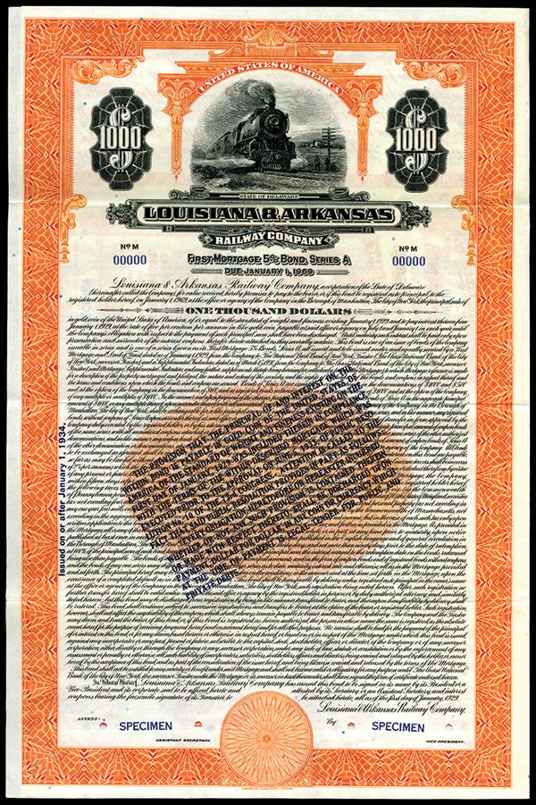Louisiana & Arkansas Railway Co., 1929 (Reissued in 1934), Specimen Bond With Rare Gold Clause. Louisiana, 1929 (Reissued January 1 1934), $1000 Specimen 1st Mortgage 5% Series A Specimen Bond, Black with orange border and underprint, Moving locomotive L-R top center, Overprinted diagonally in middle with Gold Clause stating that the bond that used to be payable in gold was now payable in "any coin or currency which at the time of payment is Legal Tender...", POC's and red SPECIMEN overprints, VF condition, ABNC. Rare with only 2 others found with this clause and unlisted in Cox with this overprint.
