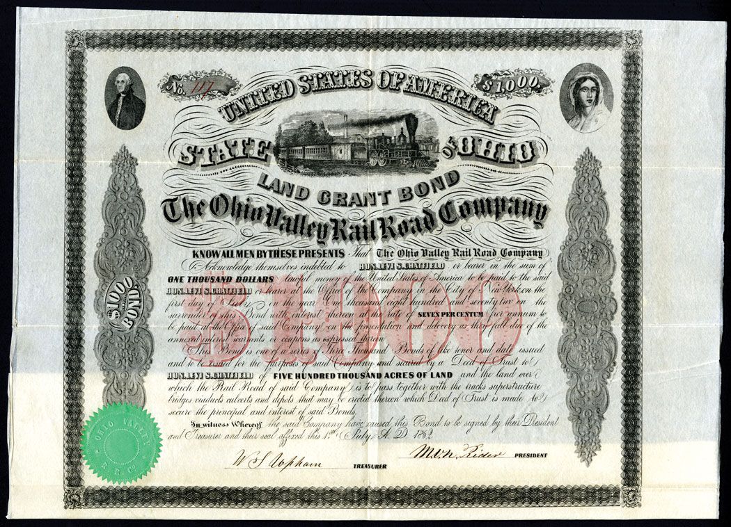 Louisiana. 1923, $1000 1st Mortgage 5% Series C Coupon Bond Specimen, Black printing with orange border and underprint, Moving locomotive top center, POC's, VF condition, ABNC. Unlisted as bond, only as a stock in Cox. Rare railroad.