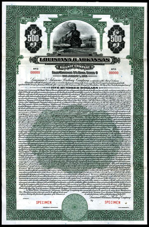 Louisiana & Arkansas Railway Co., 1939 Specimen Bond. Louisiana, 1939, $1000 Specimen 1st Mortgage 5% Series B Specimen Bond, Black with green border and underprint, Moving locomotive L-R top center, POC's and red SPECIMEN overprints, VF condition, ABNC. Unlisted denomination and color in Cox. 1 of 4 found in the archives.