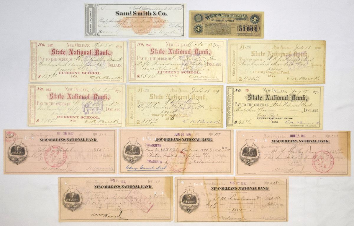 Louisiana, 1872-1903. Lot of 13 Issued bank checks Includes multiple examples from State National Bank, New Orleans; New Orleans National Bank; Saml Smith & Co.; and a Louisiana Trust Banking Co. note dated 1903. Several checks reference Current School Fund and Charity Hospital Fund payments, reflecting state treasury disbursements. Designs feature the Louisiana state seal vignette, ornate revenue stamps, and period typography. Condition ranges from Fine to Very Fine overall, with folds, light staining, edge wear, punch cancellations, and normal banking markings. (13). Sold “AS IS” no returns accepted.