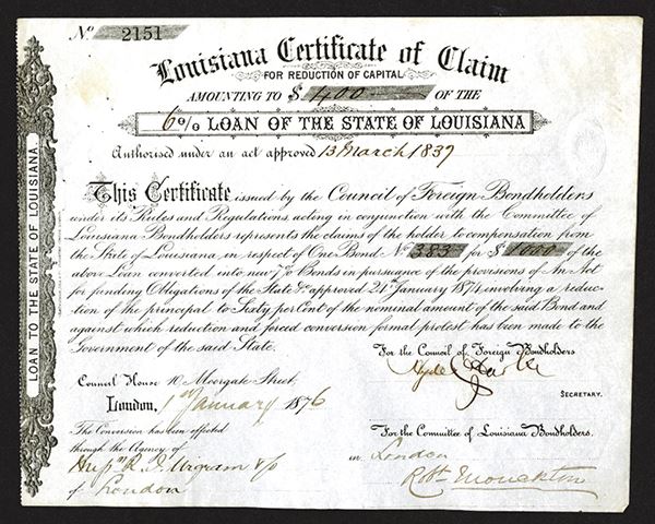 Louisiana and London, England. 6% Loan of the State of Louisiana (Authorized under an act approved 13th March 1837), $400, which represents compensation claim of the bond holder for Certificate #383 originally issued for $1000 and is now converted into a 7% bond with a 60% discount to the original face value. Issued in London by the Council of Foreign Bondholders. Scarce denomination. VF-XF.