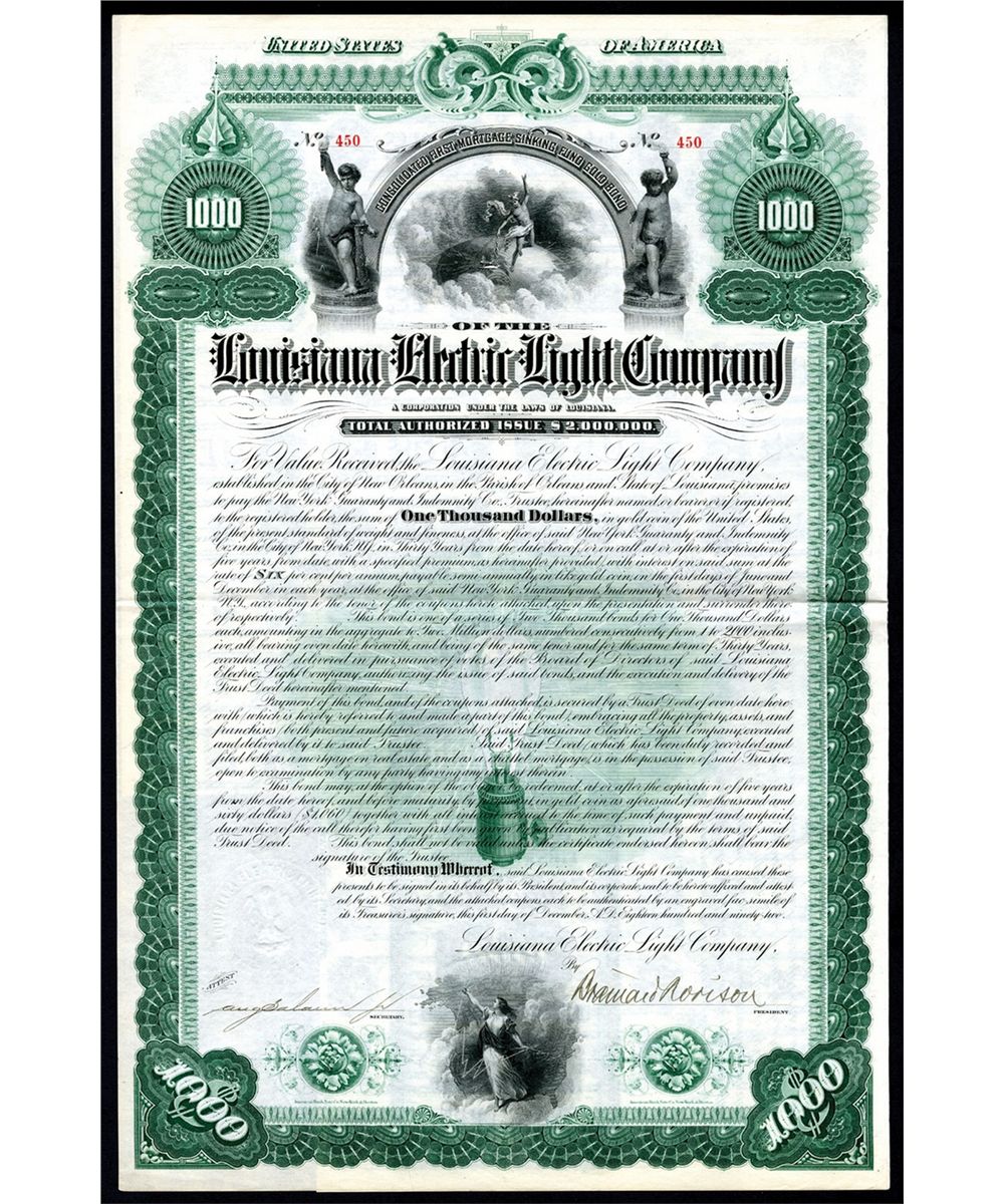 New Orleans, LA. $1000 I/U bond, cherubs flank flying Mercury with lightening on top, ornate underprint of early electric light in middle and allegorical woman at bottom. Coupons attached, XF condition. ABNC.