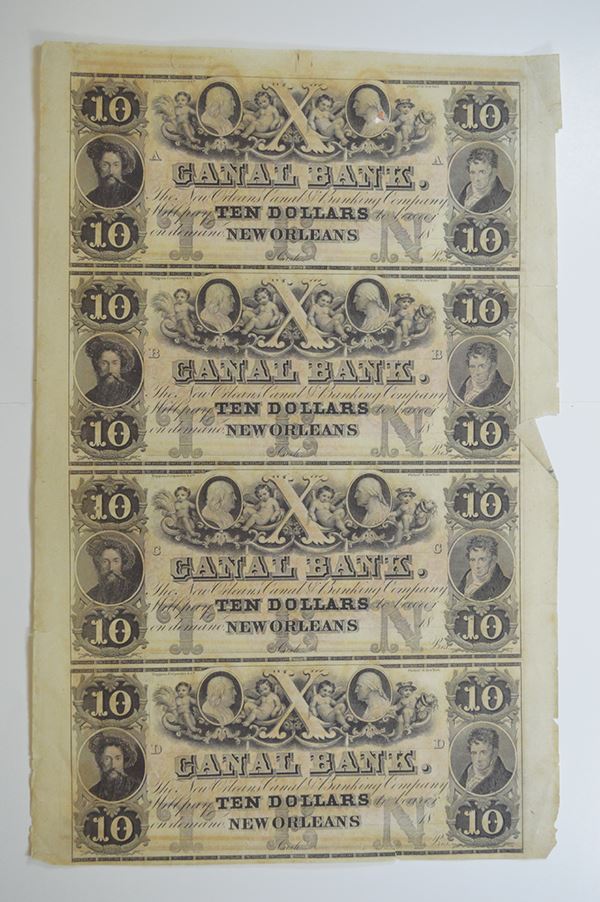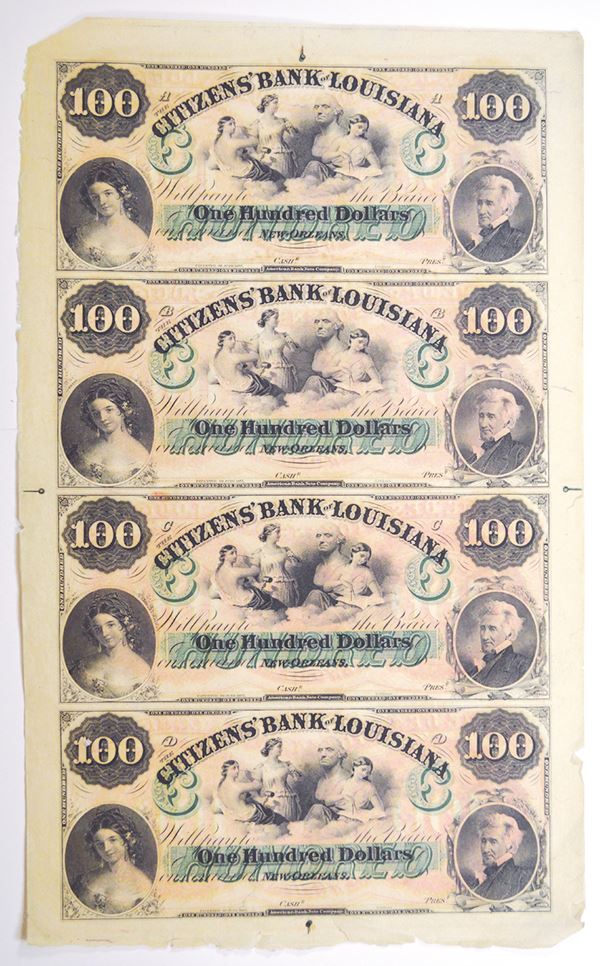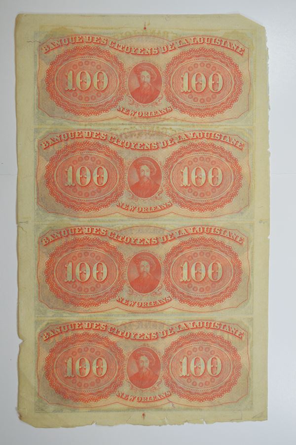 New Orleans, LA. Lot of 3 obsolete sheets, all are in AU to Uncirculated with some notes with small faults and tears, includes Citizens' Bank of Louisiana, $100-$100-$100-$100, ABNC printing; N.O Canal & Banking Co., $10-$10-$10-$20, UBS printer; Canal Bank, $10-$10-$10-$10, all with profile portraits of Washington and Franklin very similar to the ones used on the first 2 U.S. postage stamps from 1845, TCC printing; and Hungary, 1 Forint, 1-1-1-1 uncut sheet, TCC&C. Attractive sheet assortment.
