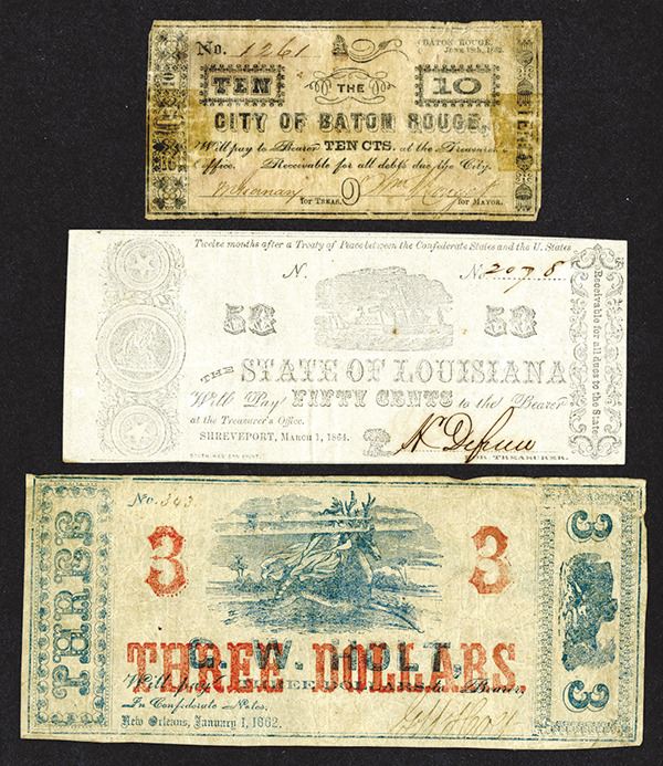 Louisiana, Lot of 3 notes. Includes Baton Rouge, 1862, 10 cents, City of Baton Rouge, Issued banknote, VG to VG+ condition; Shreveport, Louisiana, 1864, 50 cents, State of Louisiana, XF+ to AU, South Western Print; New Orleans, 1862, $3, G.W.Holt Obsolete Scrip Note, Fine condition, Issued banknote, Attractive scarce group.