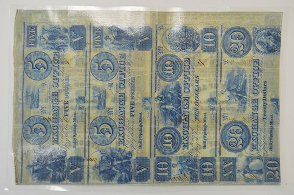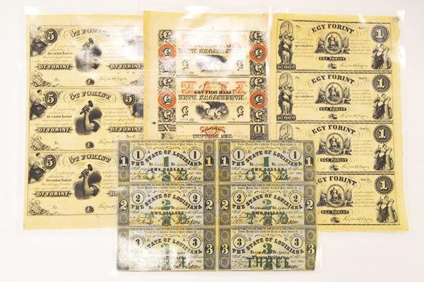 Louisiana, Mississippi and Hungary. Lot of 4 sheets, includes Louisiana, 1862, State of Louisiana, Uncut Issued sheet of 6 notes ($1-1-2-2-3-3) printed on the back of Holly Springs, MS., Uncut sheet in blue, ($5-5-10-20); Maryland, Hagerstown Bank, Uncut sheet of 4, ($10-10-5-5); 2 different Hungary sheets, $5-5-5 and $1-1-1-1. All look uncirculated but all are laminated with a very thin plastic coating. Attractive group.