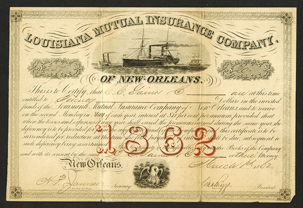 New Orleans, LA. March 1st, 1862. $20, Issued, Black with red "1862" overprint, steamship on top, pelican feeding chicks on bottom, This was issued under Confederate occupation. The Union army captured the city on April 29th, barely 2 months later. Rare late confederate insurance document. (From the collection of John E. Herzog)
