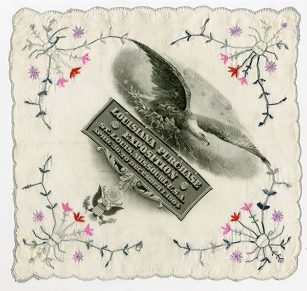 Missouri and St. Louise. Silk handkerchief that is intaglio printed in 1904 by the BEP with an image of a patriotic eagle with embroidered flowers in the corners, VF condition. The BEP printed the silk handkerchiefs at the Expo as a souvenir. BEP.