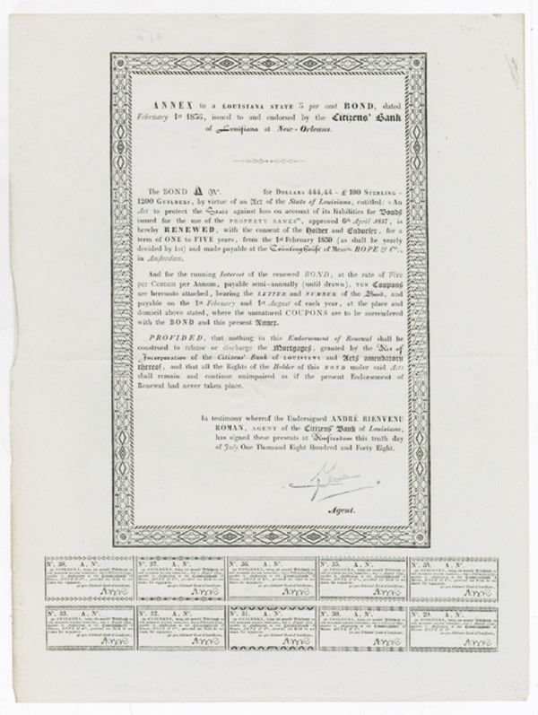 New Orleans, Louisiana. $444.44 or 100 Pounds Sterling or 1200 Guilders Issued Bond Annex, Black print on geometric black border, Title at top, VF-XF condition.