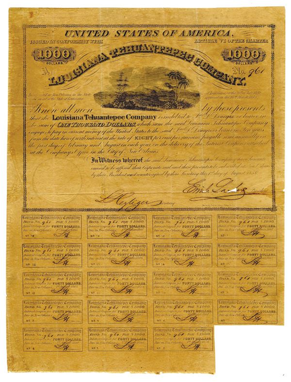New Orleans, Louisiana and Mexico. $1000 Issued and Uncanceled 8% Coupon Bond. Black print on brown paper with a tropical view with palm trees, harbor scene, and mountains at top. Fine-VF condition with some holes where it was signed, and coupons attached. Rare early Mexico related bond. (ex. R.M.Smythe, 1999, Strasburg Stock & Bond Show, Lot 1234 where it sold for $550).