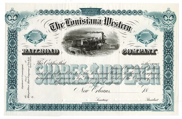 New Orleans, Louisiana. 1883 proof stock certificate printed on india paper, Black on green border and underprint, Locomotive L-R over small bridge, Approval signatures on the left counterfoil, POC's, VF to XF condition. Franklin BNC. Extremely rare with one other proof listed in Cox and this is unique as an approval proof.