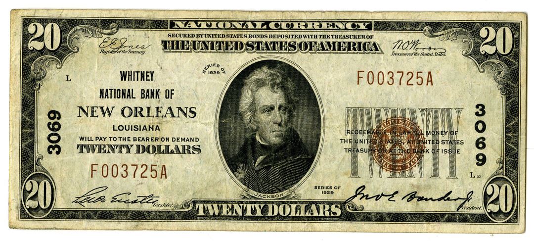 New Orleans, LA. $20, Series of 1929 T1, Ch#3069, S/N F003725A, VF to VF+ Condition.
