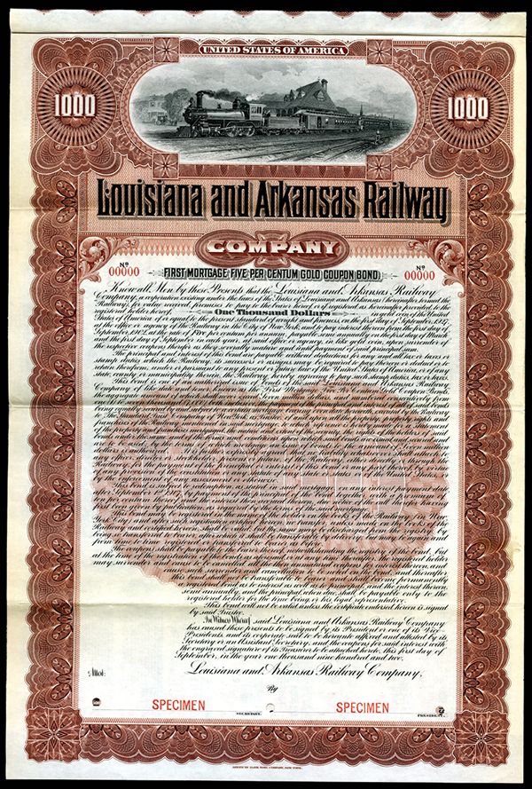 Louisiana and Arkansas Railway Co., 1902, $1000 Specimen Bond. Louisiana & Arkansas, 1902, $1000 1st Mortgage 5% Specimen Gold Bond, Black printing with brown border and underprint, Locomotive at station top center, POC's and red SPECIMEN overprints, VF condition, ABNC. The Cox plate image is from one of our previous auctions, this is the 2nd and last example of 3 found in the ABN archives.