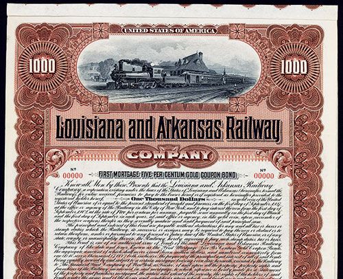 Louisiana and Arkansas, 1902, $1000, Specimen, 1st Mortgage, 5 % Gold Bond, locomotive passing station, Coupons attached. Red specimen overprints, POC's and “00000 “ serial numbers. XF condition. Scarce railroad bond. ABNC.