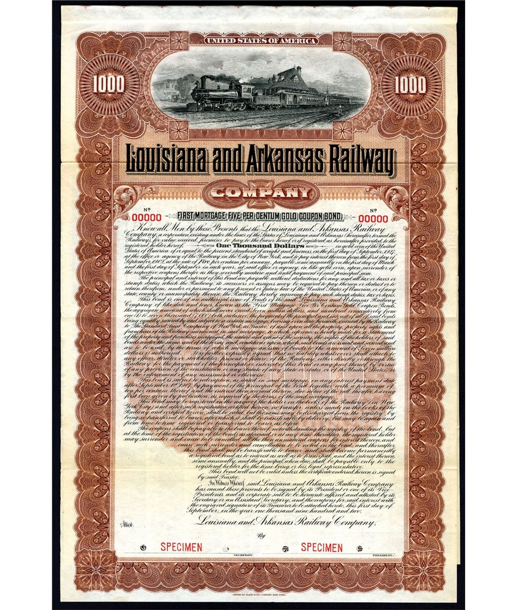 Louisiana and Arkansas, 1902, $1000, Specimen, 1st Mortgage, 5 % Gold coupon Bond, locomotive passing station R-L, Coupons attached. Red specimen overprints, POC's and "00000" serial numbers. XF condition. Scarce railroad bond. ABNC.