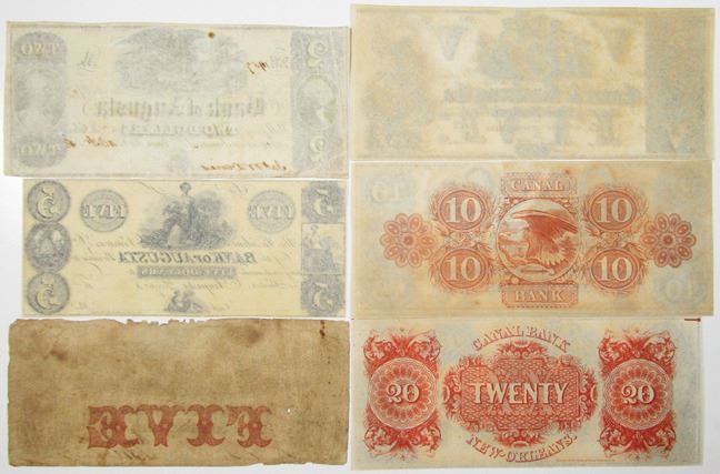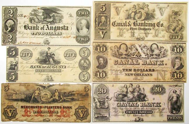 Louisiana and Georgia. Lot of 6 notes, Includes Bank of Augusta, $2 and $5 Remainders, VF to AU; Georgia, Merchants and Planters Bank, 1856, VG; and New Orleans, $5, $10 and $20, Canal Bank and Canal & Banking Co., all remainders, AU to Uncirculated. Various printers. (6)