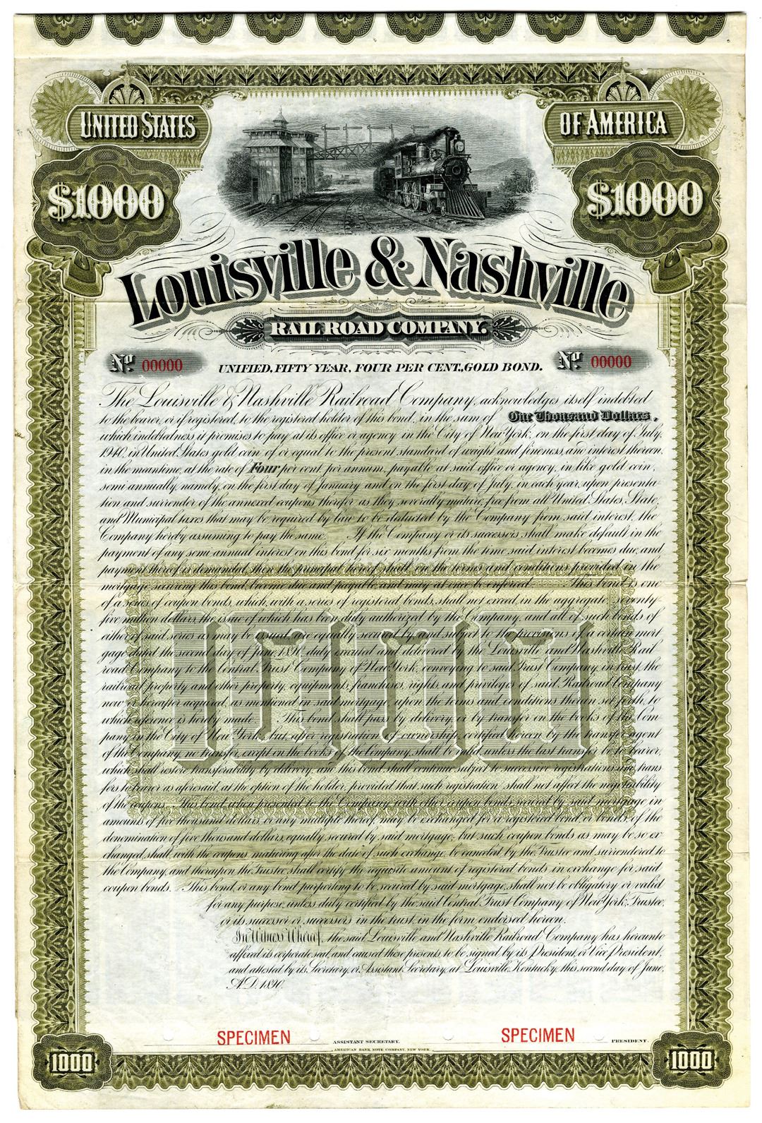 Kentucky, 1890. $1000 Specimen 4% Unified Gold Coupon Bond, Black text with olive border and undertint, Train passing under signal bridge at top center. Red specimen overprints, 00000 serial numbers, and POCs. Fine-VF condition with some splitting along fold line edges, ABNC.
